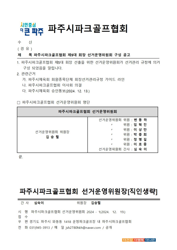 파크골프협회 파주시파크골프협회 선거운영위원회 구성 공고 페이지 정보 작성자 이장환 댓글 0건 조회 393회 작성일 24-12-19 15:19 본문 파주시파크골프협회 제 5대 회장 선거운여위원회 명단 목록 이전글파주시보디빌딩협회 회장선거관리규정 승인통보 24.12.19 다음글검도회 회장 선거운영위원회 구성 공고 24.12.18 댓글목록 댓글목록 등록된 댓글이 없습니다.