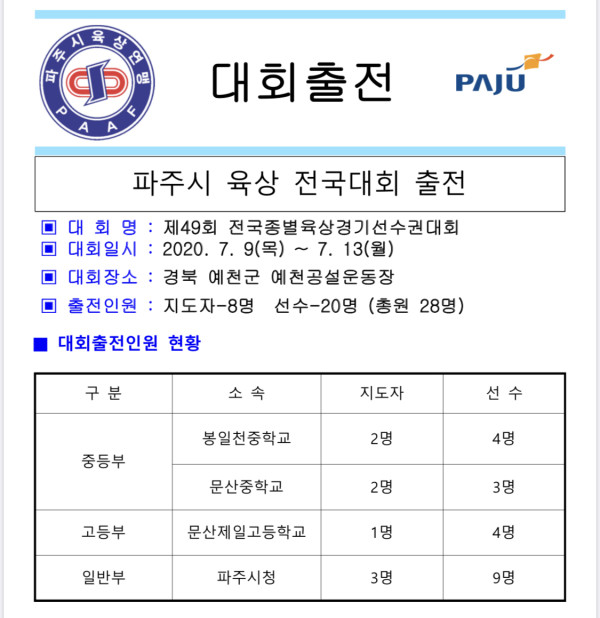 육상연맹 "제49회 전국종별육상경기선수권대회 출전" 페이지 정보 작성자 김경환 댓글 0건 조회 4,069회 작성일 20-07-02 12:54 본문 대회출전 목록 이전글파주시태권도협회 규정개정(안) 승인통보 20.07.09 다음글"제49회 춘계 전국 중.고등학교 육상경기대회 결과" 20.07.02 댓글목록 댓글목록 등록된 댓글이 없습니다.