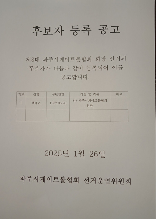 게이트볼협회 파주시게이트볼협회 회장후보자 등록 공고 페이지 정보 작성자 MGK 댓글 0건 조회 325회 작성일 25-01-30 09:22 본문 파주시게이트볼협회 회장후보자 등록 공고 목록 이전글협회장 후보자 등록 25.01.30 다음글파주시유도회 회장 당선인 공고 25.01.28 댓글목록 댓글목록 등록된 댓글이 없습니다.