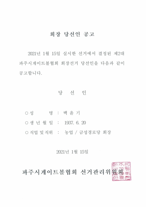 게이트볼협회 제2대 파주시게이트볼협회 회장 당선인 공고 페이지 정보 작성자 WaveKim 댓글 0건 조회 3,599회 작성일 21-01-15 16:46 본문 검색 목록 이전글파주시게이트볼협회 회장선거관리규정 승인통보 24.12.06 다음글제2대 파주시게이트볼협회 회장선거 공고 20.12.31 댓글목록 댓글목록 등록된 댓글이 없습니다.