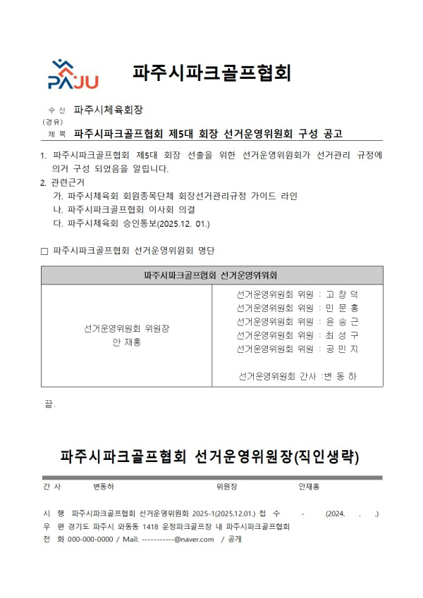 파크골프협회 파주시 파크골프협회 선거운영위원회 구성 공고(보궐선거) 페이지 정보 작성자 이장환 댓글 0건 조회 374회 작성일 25-12-01 16:05 본문 파주시 파크골프협회 제 5대 회장 선거운영위원회 명단(보궐선거) 목록 이전글파주시파크골프협회 회장선거일정 및 모집 공고 25.12.01 다음글제1회 파주시협회장배 생활체육 합기도 대회 25.11.06 댓글목록 댓글목록 등록된 댓글이 없습니다.
