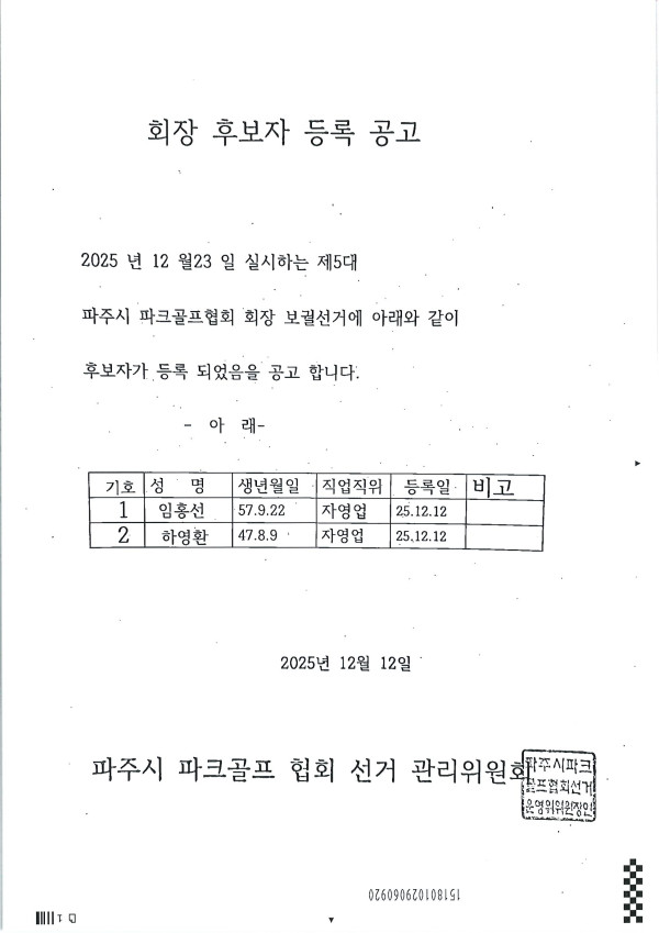 파크골프협회 파주시파크골프협회 제5대 회장 보궐선거 후보자 등록 공고 페이지 정보 작성자 이장환 댓글 0건 조회 313회 작성일 25-12-15 11:11 본문 파주시파크골프협회 제5대 회장 보궐선거 후보자 등록 공고 목록 이전글2026년 종목단체 정기대의원총회 관련 자료 25.12.16 다음글파주시파크골프협회 회장선거일정 및 모집 공고 25.12.01 댓글목록 댓글목록 등록된 댓글이 없습니다.