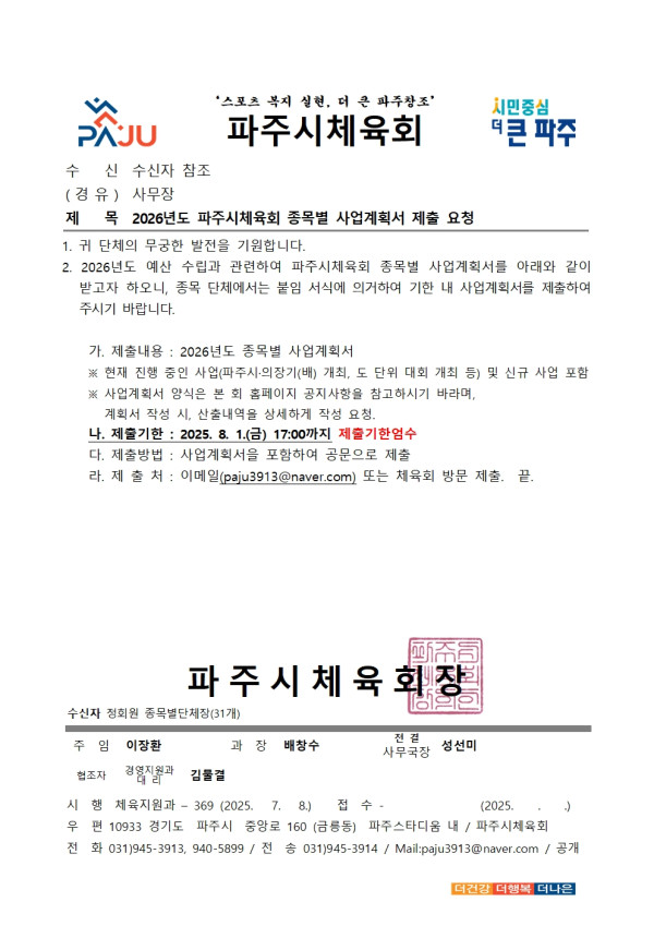 - 다음글제36회 경기도생활체육대축전 2025 파주 참가요강 및 참가신청서, 제출서류 안내 25.06.30