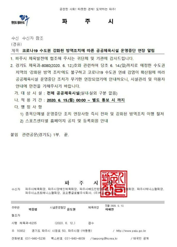 코로나19로 인한 공공체육시설 운영 무기한 연장안내