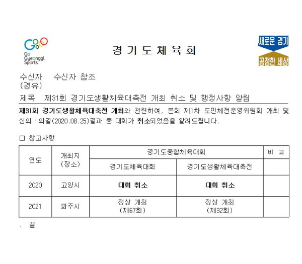 제31회 경기도생활체육대축전 취소 알림 페이지 정보 작성자 WaveKim 조회 4,907회 작성일 20-08-28 11:25 본문 고양시에서 개최 예정이었던 제31회 경기도생활체육대축전이 코로나19 바이러스로 인하여 개최가 취소됨을 알려드립니다. 목록 이전글회원종목단체 회장선거 준비관련 안내사항 20.09.15 다음글2020 체육특기자육성학교 지원 사업계획서 20.08.11