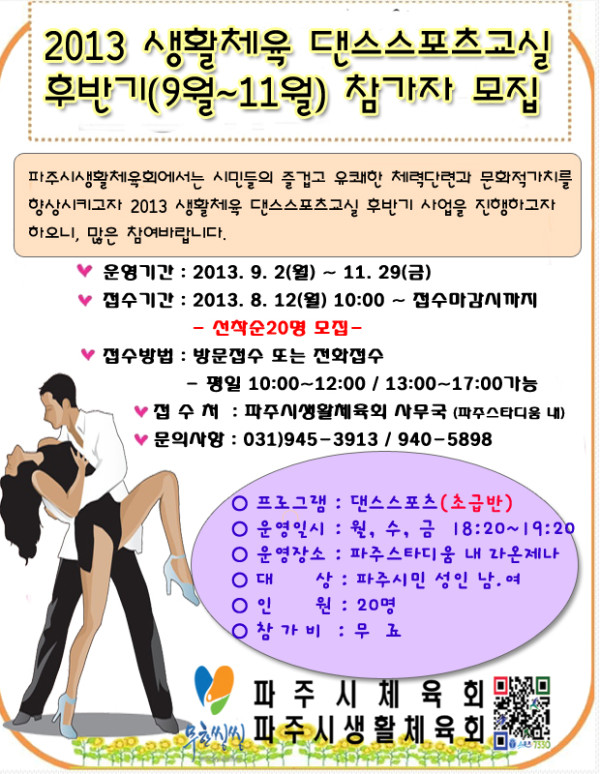 2013 생활체육(댄스스포츠)교실 후반기 참가자모집안내 페이지 정보 작성자 쫑쫑 조회 7,633회 작성일 13-08-05 09:38 본문 2013 생활체육(댄스스포츠)교실 후반기 참가자모집안내 목록 이전글2014 생활체육교실 참가자 모집 14.03.13 다음글제 24회 경기도생활체육대축전 참가요강 변경 사항 알림 13.06.10