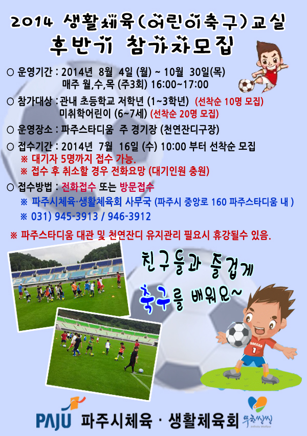 어린이 축구교실 참가자 모집 페이지 정보 작성자 쫑쫑 조회 7,000회 작성일 14-07-15 15:17 본문 어린이 축구교실 후반기 참가자 모집합니다 많은 참여바랍니다 목록 이전글개인정보 동의서 14.07.18 다음글2014년 웰빙생활체육교실 3기 참가자 모집 14.06.20