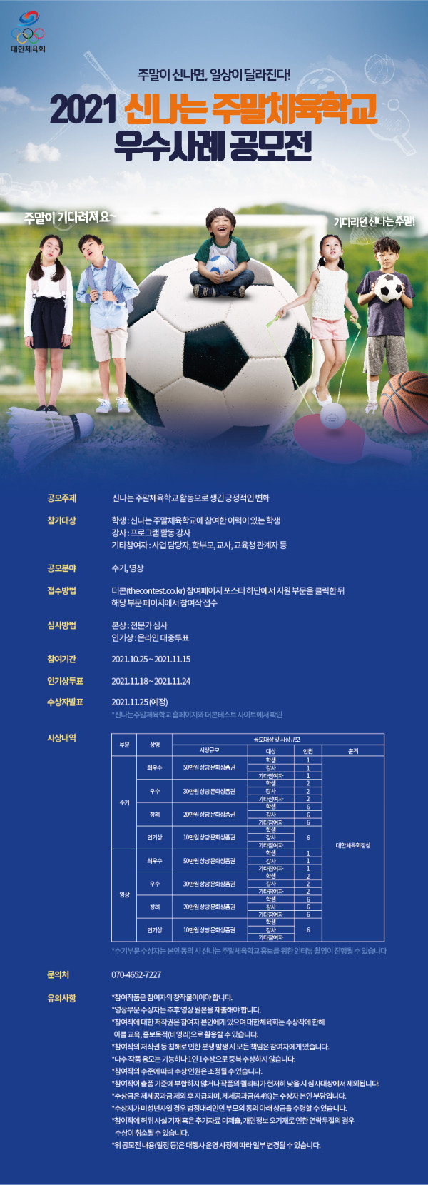 2021 신나는 주말체육학교 우수사례 공모전 참가 안내 페이지 정보 작성자 이은미 조회 4,239회 작성일 21-10-28 10:22 본문 많은 참여 바랍니다. 첨부파일 2021 신나는 주말체육학교 우수사례 공모전 개최 알림.hwp (88.5K) 11회 다운로드 | DATE : 2021-10-28 10:22:28 목록 이전글파주시의장기(배)대회 개최에 따른 보조금 신청서류 21.11.03 다음글2021 신나는 주말체육학교 학교밖 프로그램 참가자 모집(3차) 21.10.14