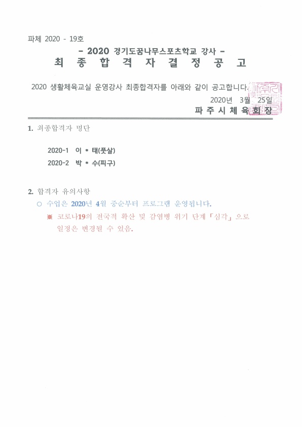 2020 경기도꿈나무스포츠학교 강사 최종합격 결정 공고