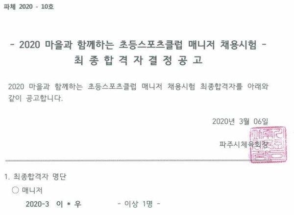 2020 마을과 함께하는 초등스포츠클럽 매니저 채용시험 최종합격자 결정 공고