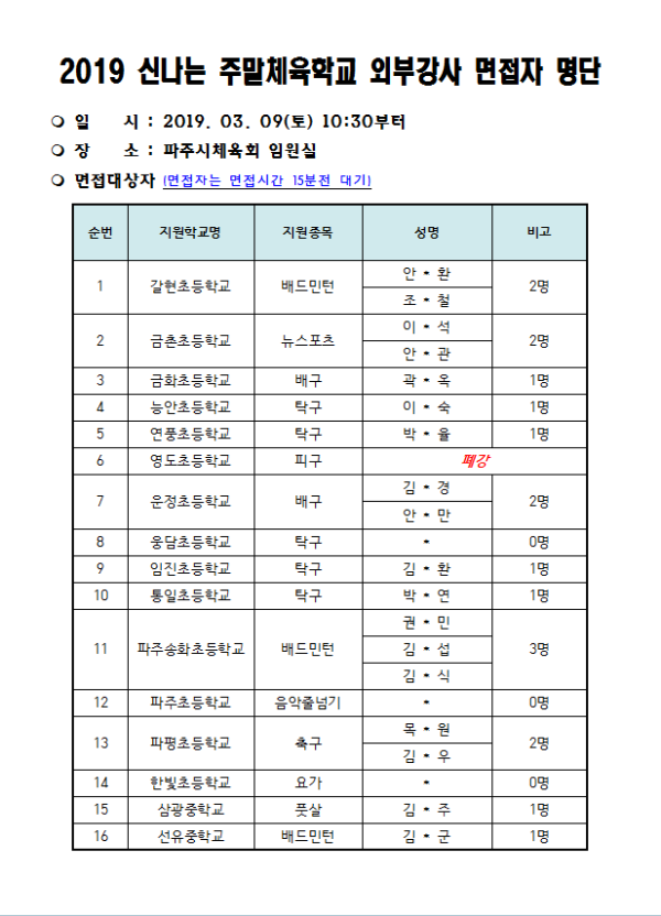 2019 신나는 주말체육학교 면접자 명단 공고 및 면접일정 공지