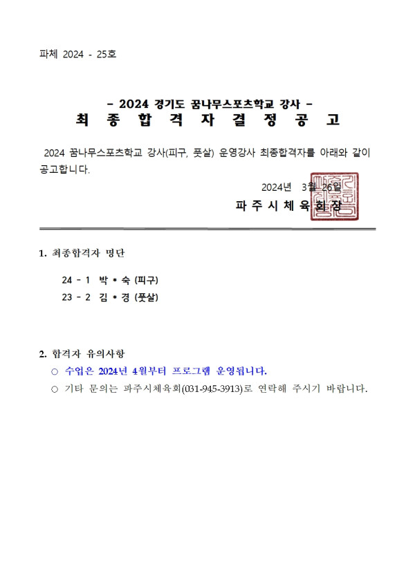 2024 경기도 꿈나무스포츠학교 강사 최종합격자결정공고 페이지 정보 작성자 배과장 조회 1,126회 작성일 24-03-26 11:23 본문 목록 이전글2024 경기도 꿈나무 스포츠학교 강사 최종 합격자 결정 공고 24.03.26 다음글2024년 마을과 함께하는 초등스포츠클럽 2차 강사모집 합격자 발표 24.03.25