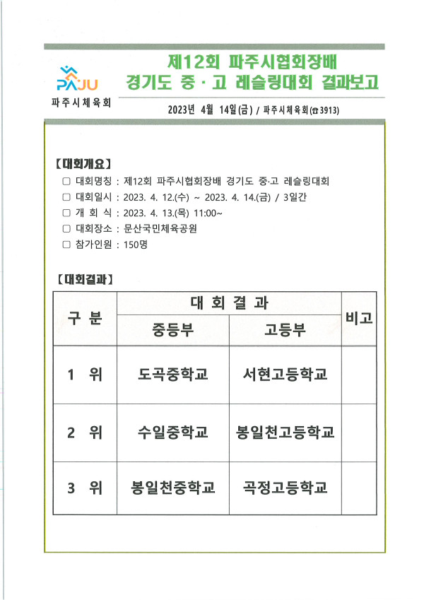 제12회 파주시협회장배 경기도 중,고 레슬링대회 페이지 정보 작성자 사업운영팀 조회 1,687회 작성일 23-06-09 14:40 본문 4.12.~4.14. 문산국민체육센터 목록 이전글제5회 파주시협회장기 배드민턴대회 23.06.09 다음글제7회 파주시협회장배 족구대회 결과보고 23.04.27