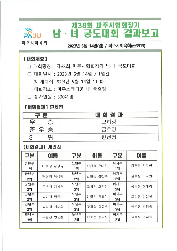제38회 파주시협회장기 남녀 궁도대회 페이지 정보 작성자 사업운영팀 조회 1,615회 작성일 23-06-09 14:43 본문 5.14. 금호정 목록 이전글제20회 파주시협회장기 태권도대회 23.06.09 다음글제5회 파주시협회장기 배드민턴대회 23.06.09