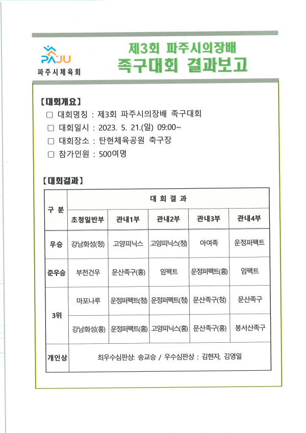 제3회 파주시의장기 족구대회 페이지 정보 작성자 사업운영팀 조회 1,551회 작성일 23-06-09 14:45 본문 5.21. 탄현체육공원 목록 이전글제13회 파주시연맹회장배 스쿼시대회 6.17. 23.06.19 다음글제20회 파주시협회장기 태권도대회 23.06.09