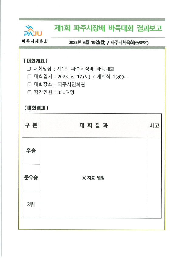 제1회 파주시장기 바둑대회 결과 페이지 정보 작성자 사업운영팀 조회 1,561회 작성일 23-06-23 15:52 본문 파주시민회관 대공연장 목록 다음글제13회 파주시연맹회장배 스쿼시대회 6.17. 23.06.19
