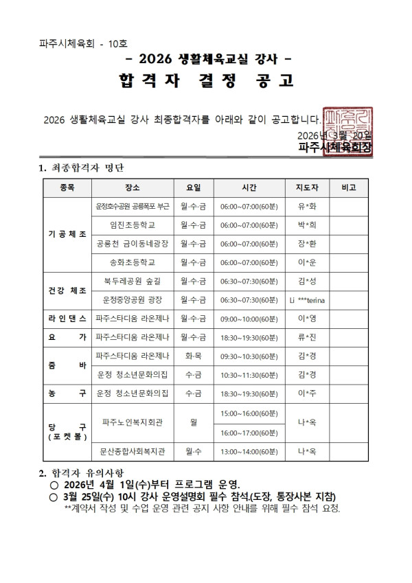 2026년 생활체육교실 강사 합격자 결정 공고 페이지 정보 작성자 사업운영팀 조회 28회 작성일 26-03-20 10:28 본문 목록 다음글2026년 경기도 체육인 사회기여 확산 사업 안내 26.03.10